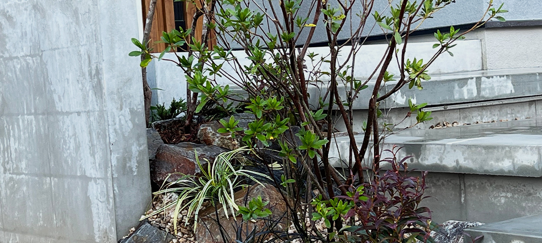 無機質な壁と階段の間に盛土を行い、その上に中木を植えております。