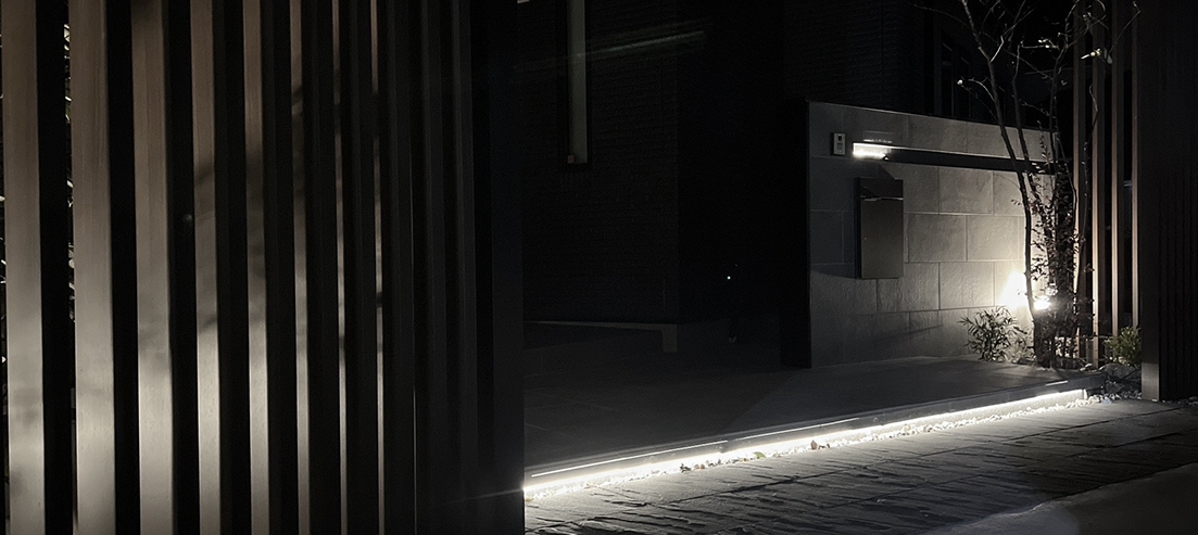 夜、仕事から帰宅すると、まず目に飛び込んでくるのは、ライトアップされた植栽の美しいシルエットです。